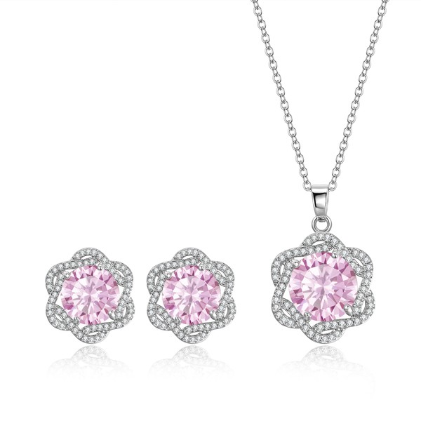 EleQueen Women's Silver Tone CZ Round Pink Crystal Flower Floar Necklace Earrings Jewelry Set for Wedding Bridal