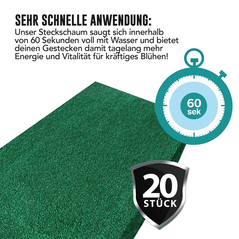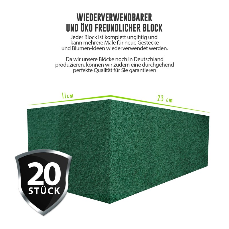 • Perfect size for your ideas: each of the 20 bricks has a size of approx. 23 x 11 x 7.5 cm. So that the floral foam also looks great with your flowers, we deliver it in a rich green.