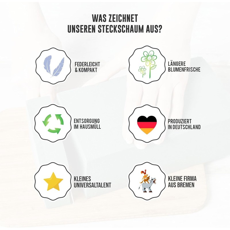 • Especially easy to use: the flower foam is made of high-quality polyurethane and is manufactured in Germany under strict controls. The material can be easily shaped into the shape of your choice with a knife or scissors.
