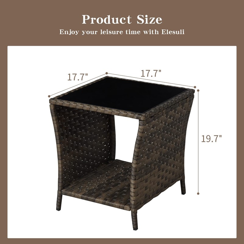 - 【Overall Size】Elesuli wicker rattan side table total size is 18"L x 18"W x 19.7"H, include 1 table with glass, shipping with 1 box. bistro table,outdoor furniture,outdoor side tables,patio furniture,patio rattan side table,patio side table,square storage furniture,wicker end table, wicker glass top table,wicker outdoor side tables,wicker side table,wicker table,woven table