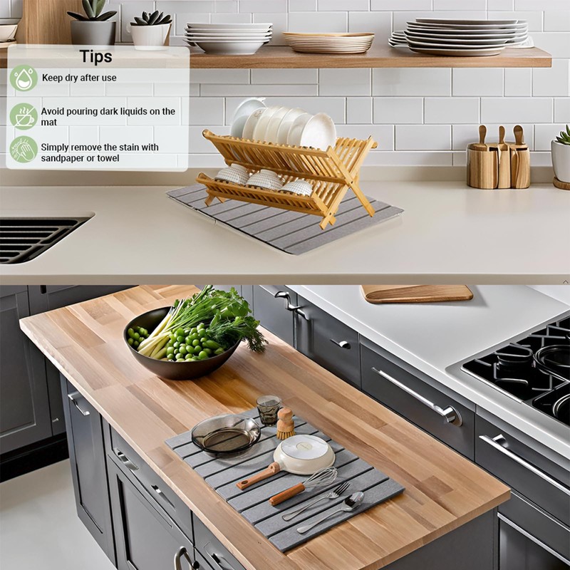 - Fast absorption and drying: Our stone drying mat for kitchen counter is made of highly effective natural diatomaceous earth material, which absorbs water up to 50% faster than fabric mats, keeping your kitchen countertops dry and clean in minutes. say goodbye to moisture and odors!