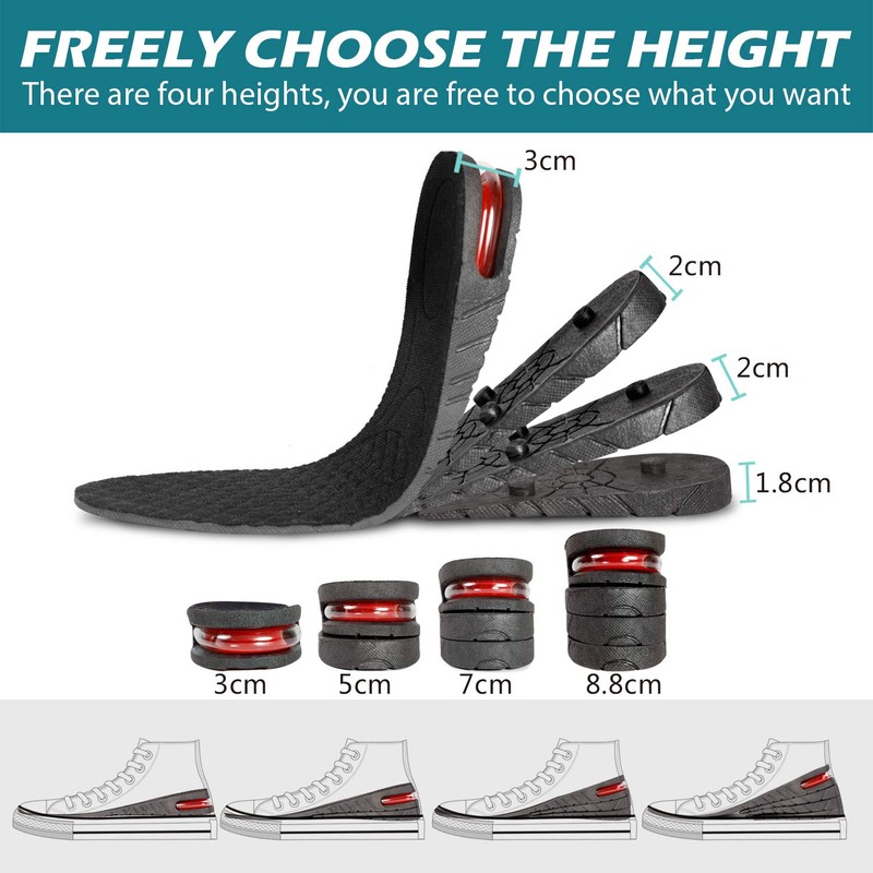 - La plantilla de aumento de altura es ajustable de 3 a 9 cm. Adecuado para zapatos de alta calidad: zapatos de lona de alta calidad, zapatos de piel, botas, etc. Nota: no es adecuado para zapatos bajos.