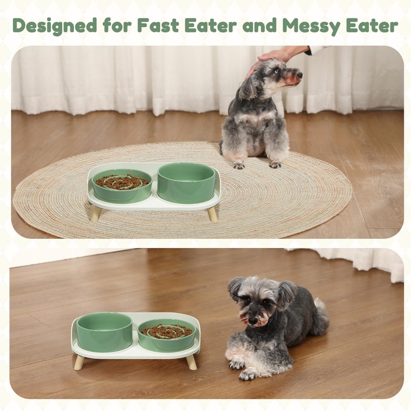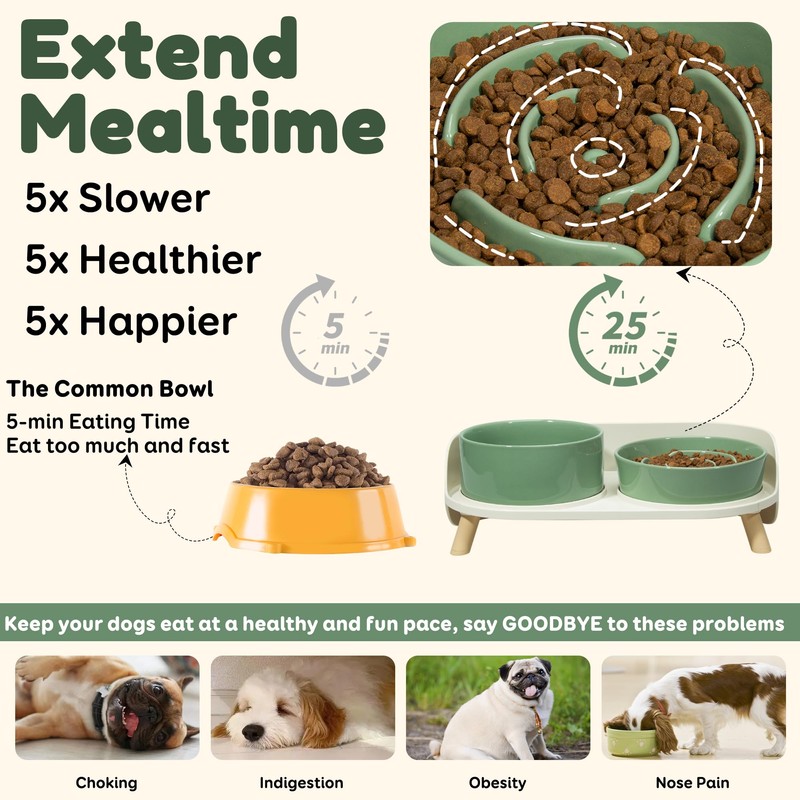 - Raised Base & No More Mess - The slow feeding dog bowl set with a proper height allows dogs to eat and drink in comfortable posture, reduce stress on their neck and joints. An elevated dining table with non-slip feet wiill catches food and water spills, keeping your pet feeding area tidy.