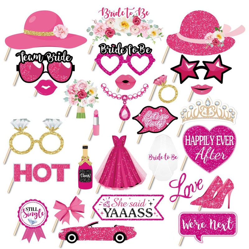 - PINK BACHELORETTE PROPS: We've handcrafted 28 dreamy pink photo props that wrap your bridal party in soft, rosy joy. Each piece washes your photos in that perfect pink glow - the kind that makes everyone look radiant, happy, and ready to celebrate love