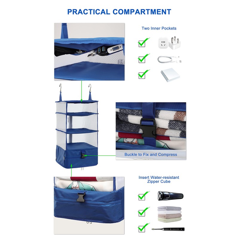 - [Match Needs with Possibilities] - ELEZAY hanging packing organizer, a versatile solution combining a portable closet and a packing cube. Its hanging shape suits wardrobes, while the compression shape, aided by a Buckle+Adjustable binding strap, saves space. With three forms – hanging, in-suitcase, and compact storage – packing becomes easy. Compress, buckle, stow in your carry-on, and hang in the hotel closet for easy access, eliminating the need to dig for clothes.