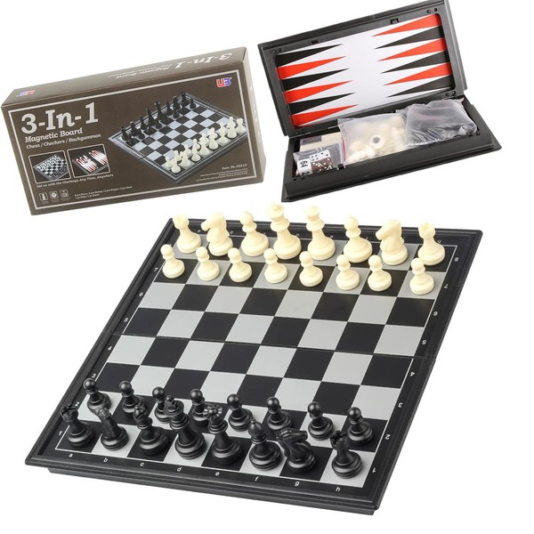 Elfclove3-in-1 Magnetic Chess Checkers and Backgammon Board Game for Children and Adults, Portable Folding Travel Set
