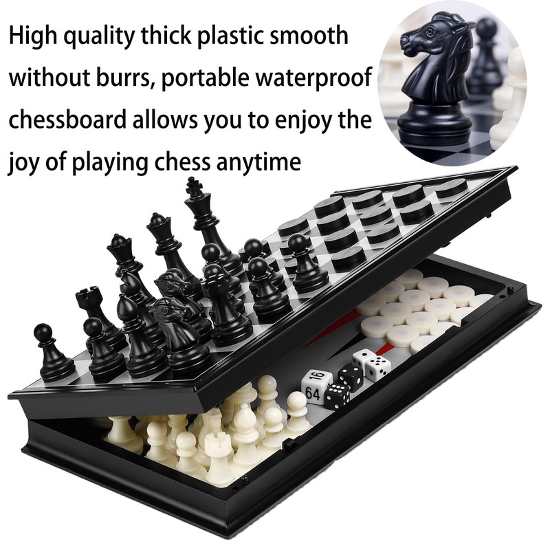 • ► [3-in-1 Magnetic Chessboard] With this game set, you can play chess, checkers, and backgammon anytime, anywhere. The size of the game board is 9.84x9.84x0.787in.