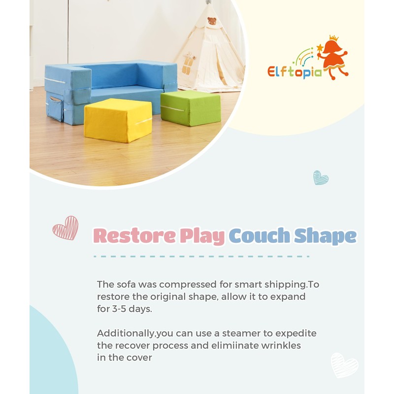 - ❤Verstaile Kids Play Couch❤ The Eltopia kids sofa offers more than just comfort – it fosters creative play as well.It enjoys endless possiblities for your kids,allowing your little ones to explore themselves.It takes no effort to tranform the sofa into other shape.It can be used as a table,sleeper bed,pupet show frame,fort frame,ball pool,or hidout