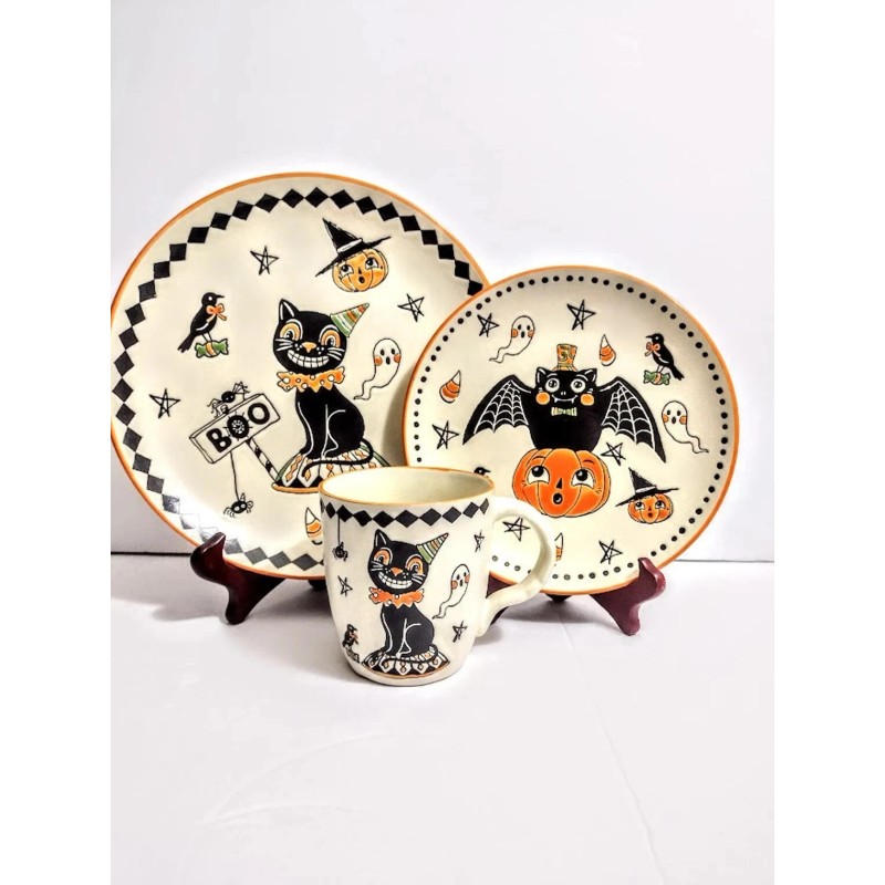 In other listings available salad plates 8.5", coffee mug 4.5" tall, approx. 4" diameter, there is two options- with a cat and with a bat ( both mug sides has the same image cat or bat )