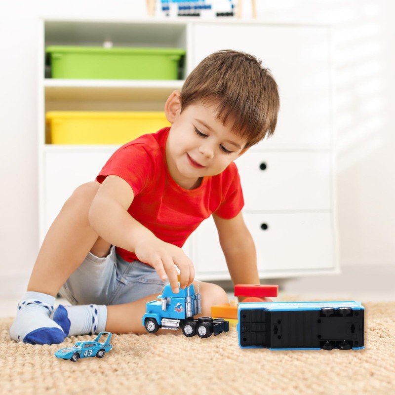 - Toy cars: includes 1 truck and 1 racing car. The transport trolley has an extendable ramp at the rear, which can be used for getting on and off the trolley. Provide unlimited fun and give children a joyful entertainment time.
