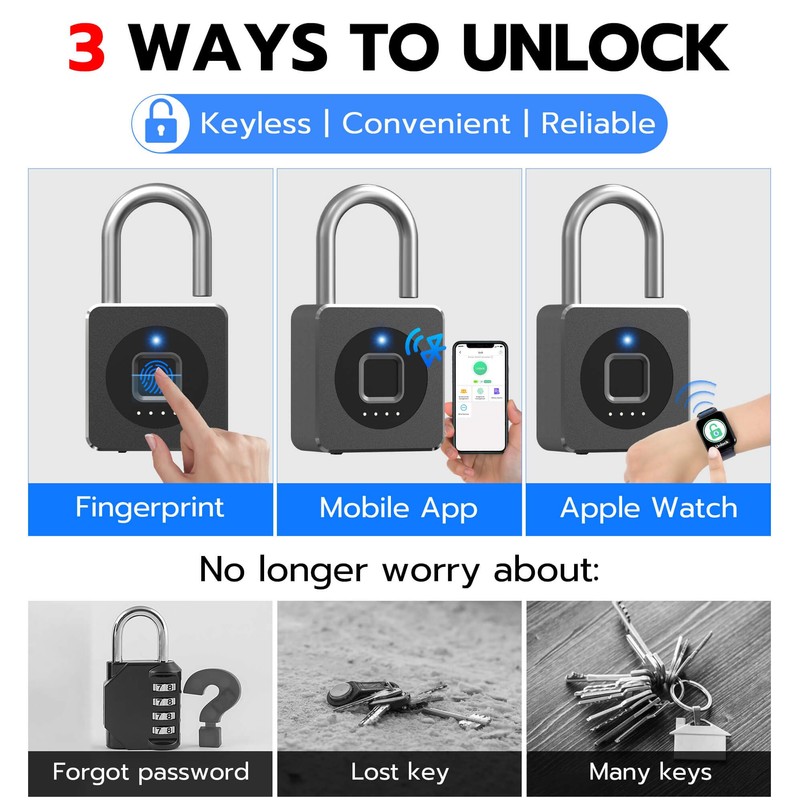 - 【ADVANCED FINGERPRINT READER】: The fingerprint padlock uses advanced biometric technology, touch your finger to unlock within 0.2s, the unlocking speed is much faster than ordinary combo locks and key locks. Your finger is the key, no longer worry about losing the key or forgetting the password.