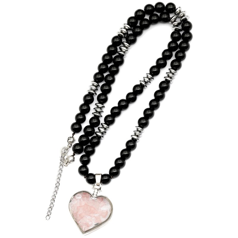 ElisaJewelryArt - Natural Pink Quartz Heart Pendant Black Onyx Stone Beaded Necklace Genuine Gemstone Love Stone Clasp Closure Necklace Unisex Necklace (22, Pink Quartz)
