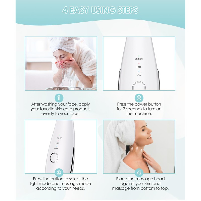 - How to Use: Cleanse the face and apply some skincare products before use. Press and hold the button to power on and select the mode you need. Hold the sensing rings on both sides and place the sensor on your skin, the device will start vibrating. It is recommended to use once or twice a day for five to ten minutes.