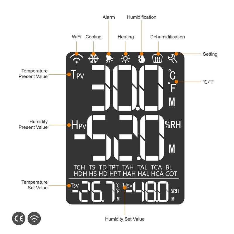 - Its functions include high or low alarms, start delay, temperature or humidity calibration, temperature unit ℃/℉ and continuous working time for humidity.