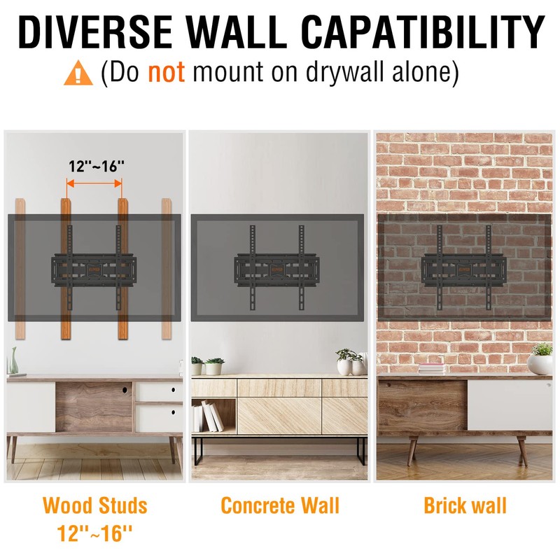 - Universal TV Mount - YD3007 TV bracket fits most of 26”-65” TVs with VESA pattern from 75x75mm(3”x3”) to 400x400mm(16”x16”). This tv mount can be mounted to 8/16 Inch wood studs, concrete, or brick walls. Please CHECK TV weight, size, VESA size, studs spacing, and input access before purchase.