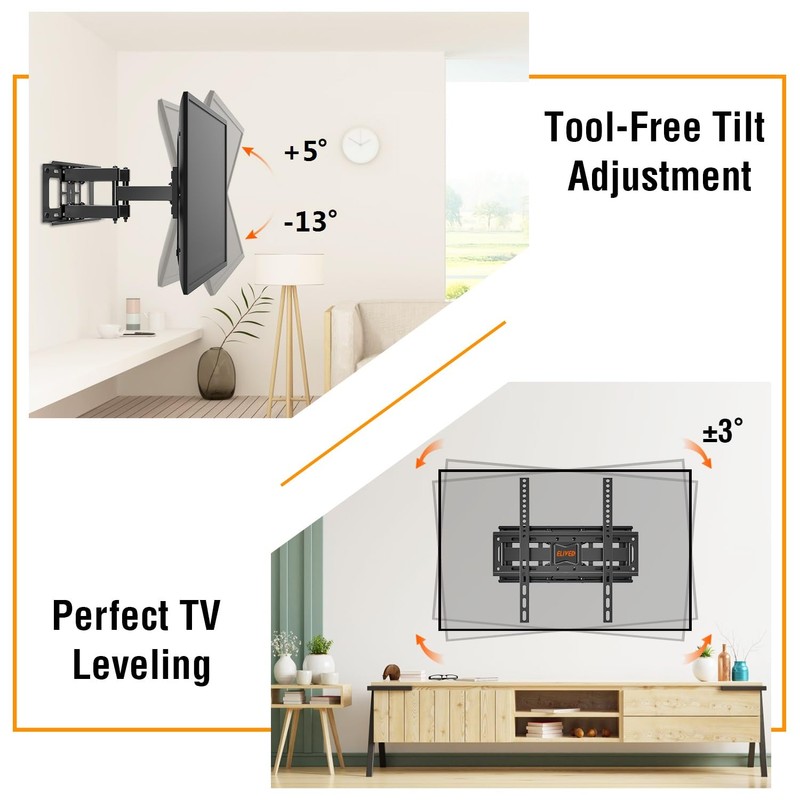 - Optimized Viewing Experience - ELIVED full motion TV mount features in Tilting +5/-13º adjustment angle to reduce reflection from light or windows, swivel +/- 45º to cover more viewing position. The swivel TV mount provides a smooth 15.5" extension and 2.8" depth to the wall. You can level the TV screen +/-3º after to get straight on the screen.