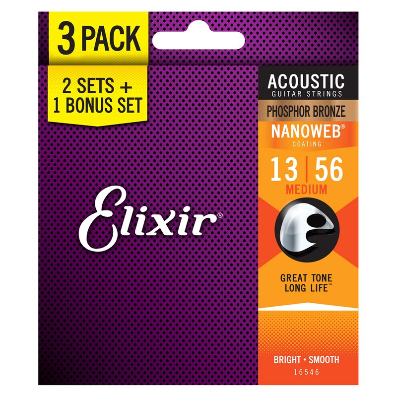 Elixir Nanoweb 16546 Acoustic Ph Bronze 13-56 Western Guitar Strings Pack of 3