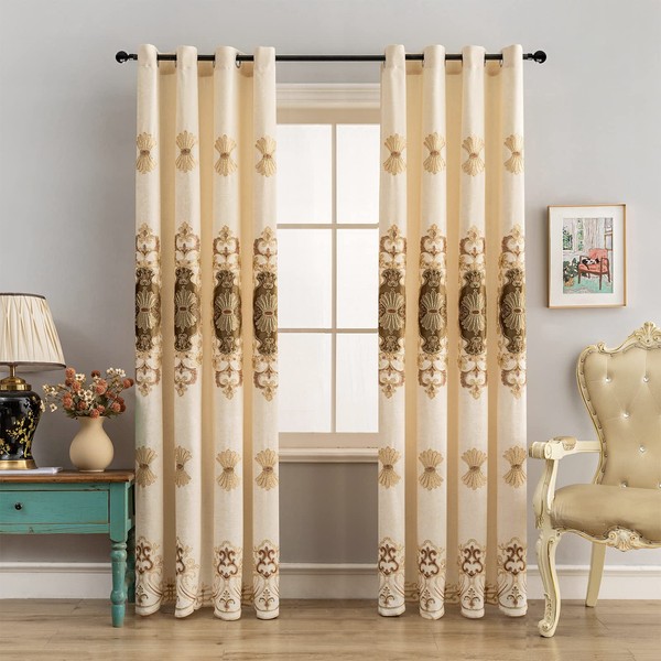 ELKCA Beige Chenille Curtain with Classical Embroidered Pattern for Living Room European Curtains for Bedroom,Grommet Top,52" W x 84" L,2 Panels