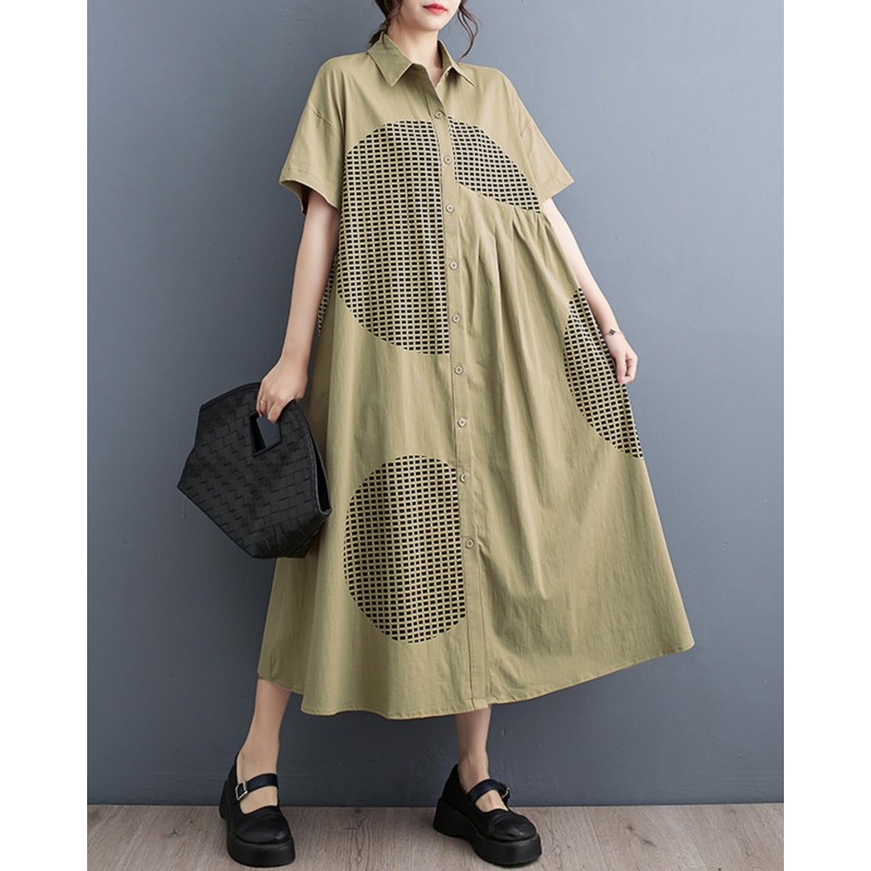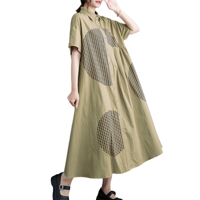 ellazhu Women's Short Sleeves Button Down Patchwork Pattern Print Shirt Dress GZ151 Khaki