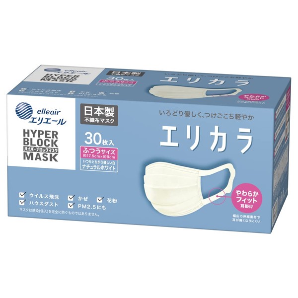Elleair Hyper Block Mask, Made in Japan, Erikara Natural White, Regular Size, 30 Pieces, PM2.5 Compatible