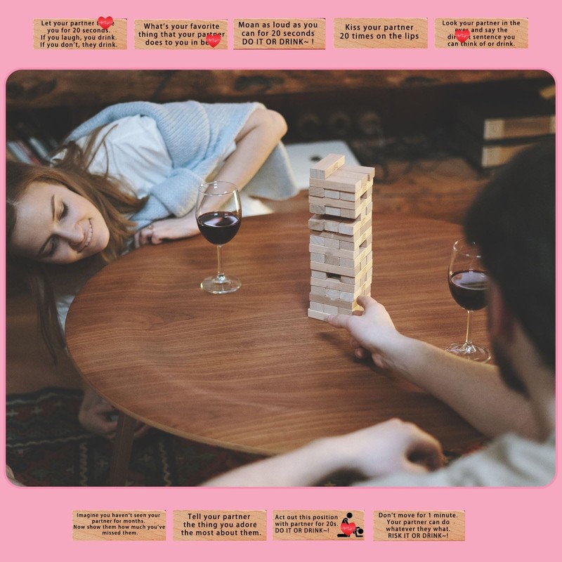 Multiple Uses: While perfect for couple date nights, this versatile game can also be used for other purposes, such as family gatherings and team-building exercises. The stacking blocks can even be used for educational activities like memory games, problem-solving, or building creative structures.