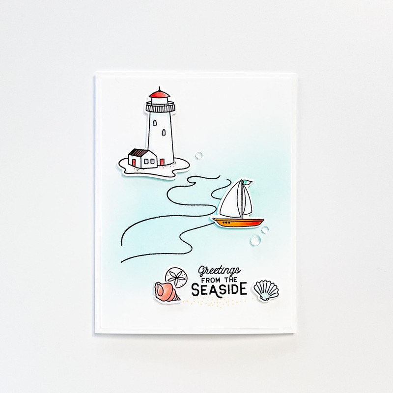 - Build a nautical scene with the images in this stamp set: lighthouse, sailboats, seashells, life saver, lobster, water waves, birds, and sand. The 4 sentiments in the stamp set will complete your project nicely.