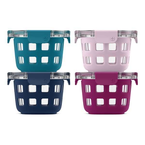 Make meal prep fun with the Ello DuraGlass 8-piece 2-cup Reusable Glass Container Set! This set includes four 2-cup/16 oz containers, perfect for overnight oats, yogurt, small snacks, and leftovers. The BPA-free plastic lids have airtight snaps to prevent leaks and keep your food fresher for longer. These containers are dishwasher safe, and microwave and oven safe without the lid. There's no need to remove the silicone sleeve! DuraGlass is non-porous, so it won't absorb food odors, flavors, or stains. Please note: do not place hot containers on wet or cold surfaces.