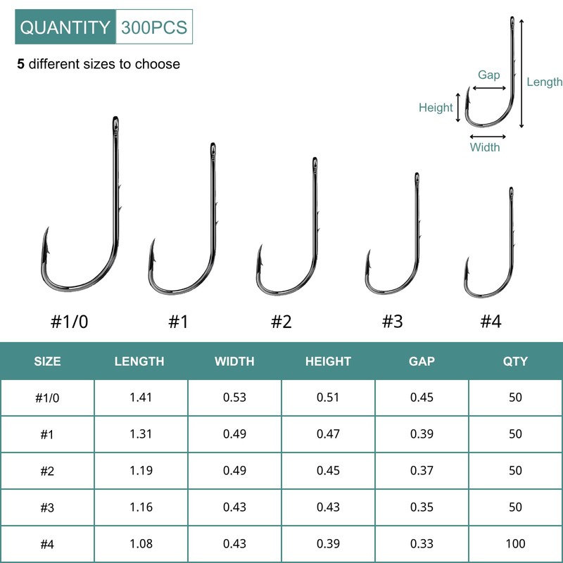 - 【Assorted Sizes for Versatile Use】 Includes 300 hooks in 5 popular sizes: 1/0# 50pcs, 1# 50pcs, 2# 50pcs, 3# 50pcs, and 4# 100pcs, allowing you to adapt to various fishing conditions and target species like bass, trout, catfish, and panfish