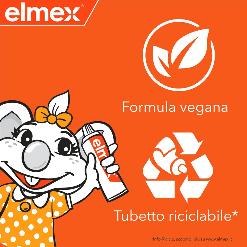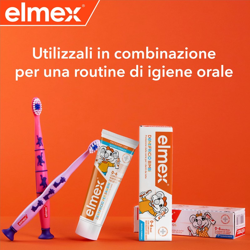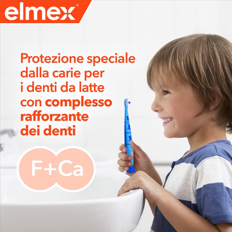 - Elmex Kinderzahnpasta bildet eine Schutzschicht aus Kalziumfluorid auf dem Zahnschmelz und macht die Zähne widerstandsfähiger gegen Mineralverlust, der durch Karies verursacht wird