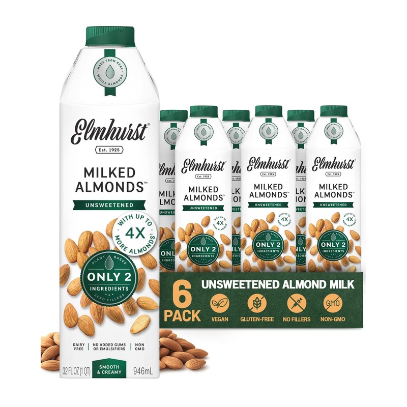 Elmhurst 1925 Unsweetened Almond Milk - 32 Ounce (Pack of 6) Dairy-Free, Vegan, Kosher, No Added Sugar, Shelf Stable Milk Made with Water & Almonds for Healthier, Simpler Plant-Based Alternatives