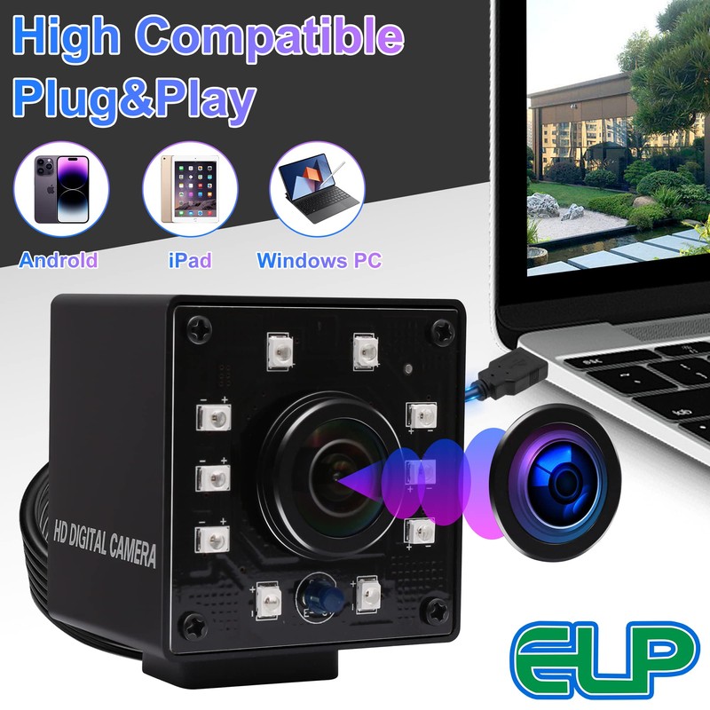 ELP 1080P Night Vision USB Camera with Wide Angle Fisheye Lens for Computer 2mp Mini IR Infrared Webcam UVC USB2.0 High Speed 100fps Industrial PC Camera Home Surveillance CCTV USB with Camera