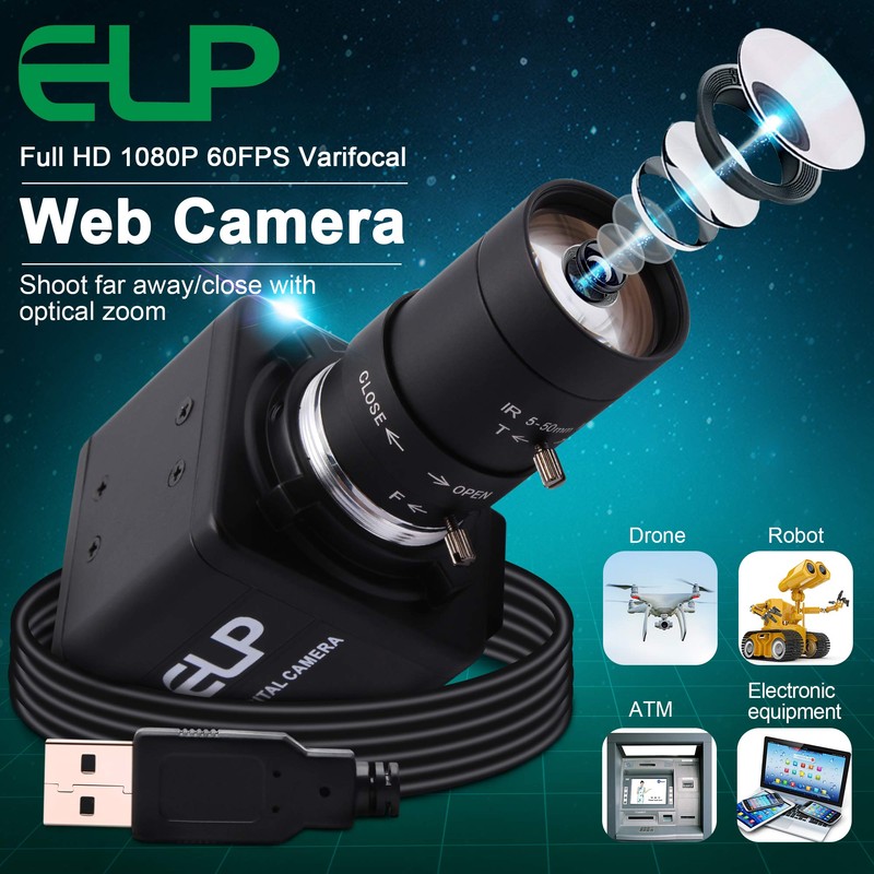 ELP USB Camera 2 Megapixel USB Webcam 5-50 mm Manual Variable Zoom Lens HD Camera USB Compatible with Mac/Windows/Linux/Android UVC Adjustable Focus Web Camera (1080P OV4689 Sensor)