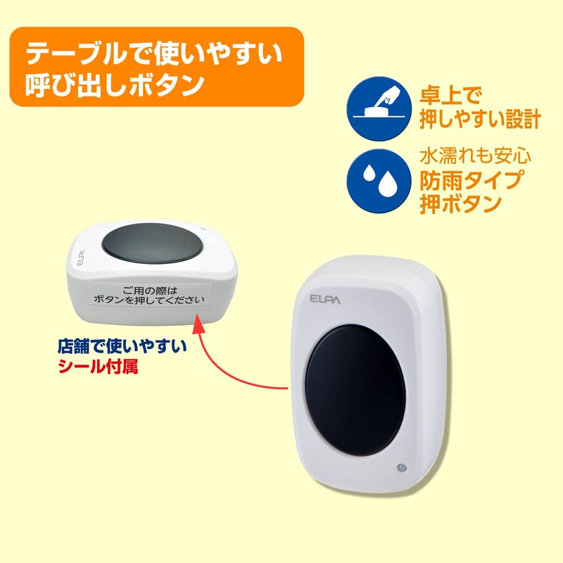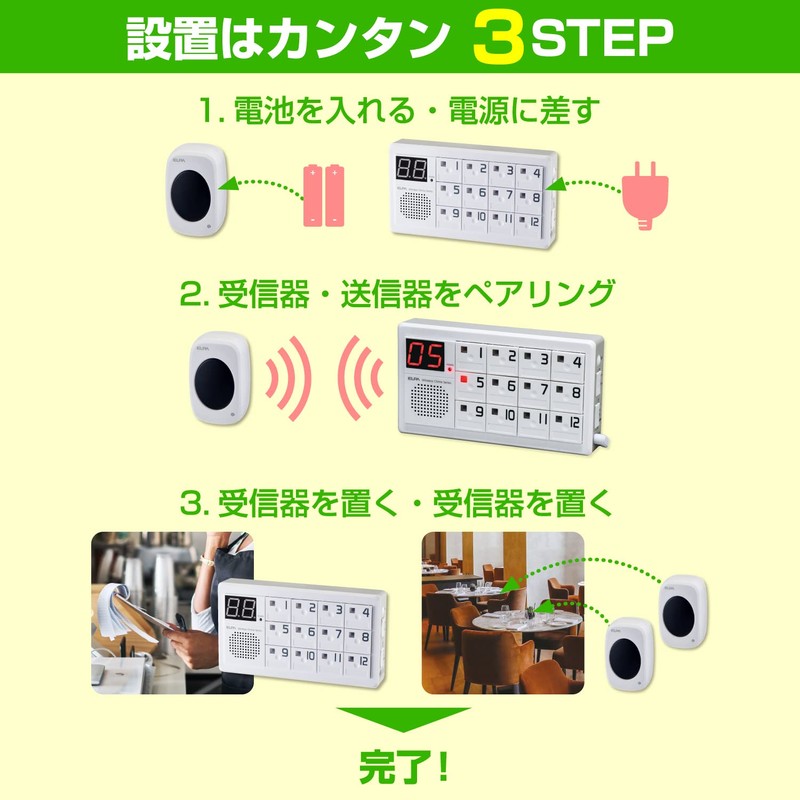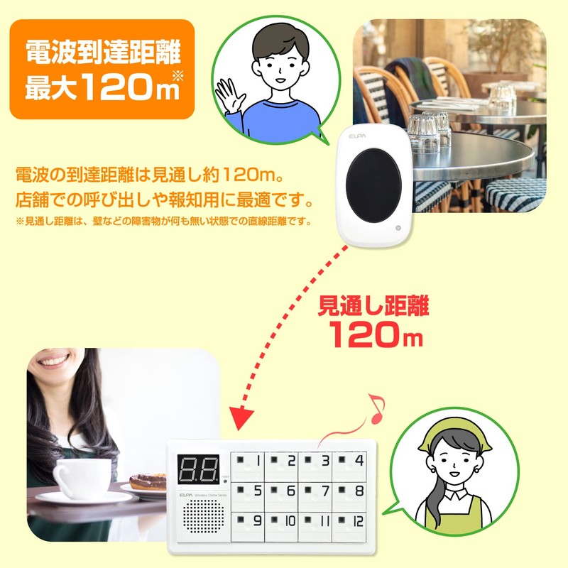 - (Various uses) Can be used for a variety of purposes, such as a call bell for restaurants, office receptions, hospital call bells, and notifications from a room of the facility, or from a distance of the bath. The numbers are displayed so you can see where you are calling