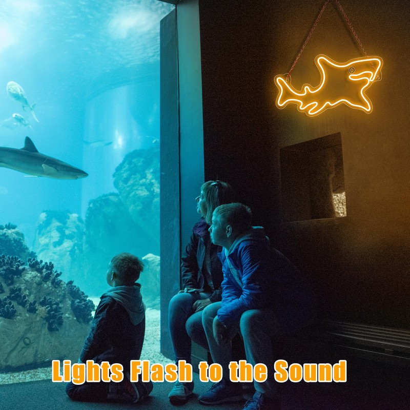 - Flashing Shark Led Neon Night light: Shark light up neon light, connect the power to choose the voice activated mode, the shark neon lights mode will move with the sound, both vocals and music can follow the bright flashing, the shark lamps will be the most special Christmas shark themed bar decorations, shark themed party decorations, and room decorations.
