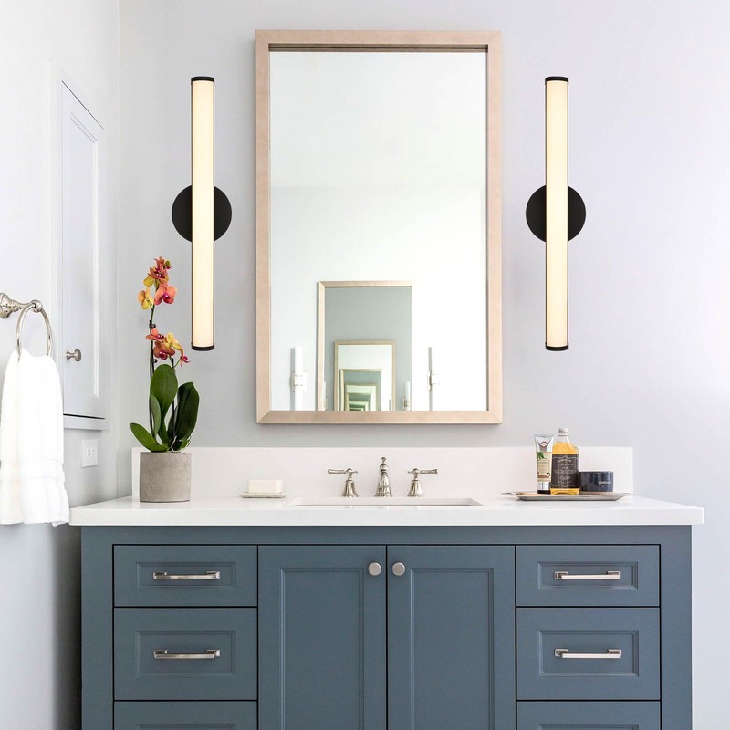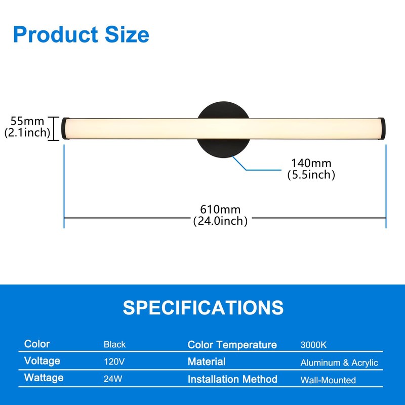 - 【Modern Minimalist Design】Crafted with a matte black metal base and a sleek cylindrical acrylic shade, this 24-inch bathroom vanity light fixture adds a clean, contemporary style to any space. Ideal for mirror lighting, it delivers soft and uniform illumination with a modern touch