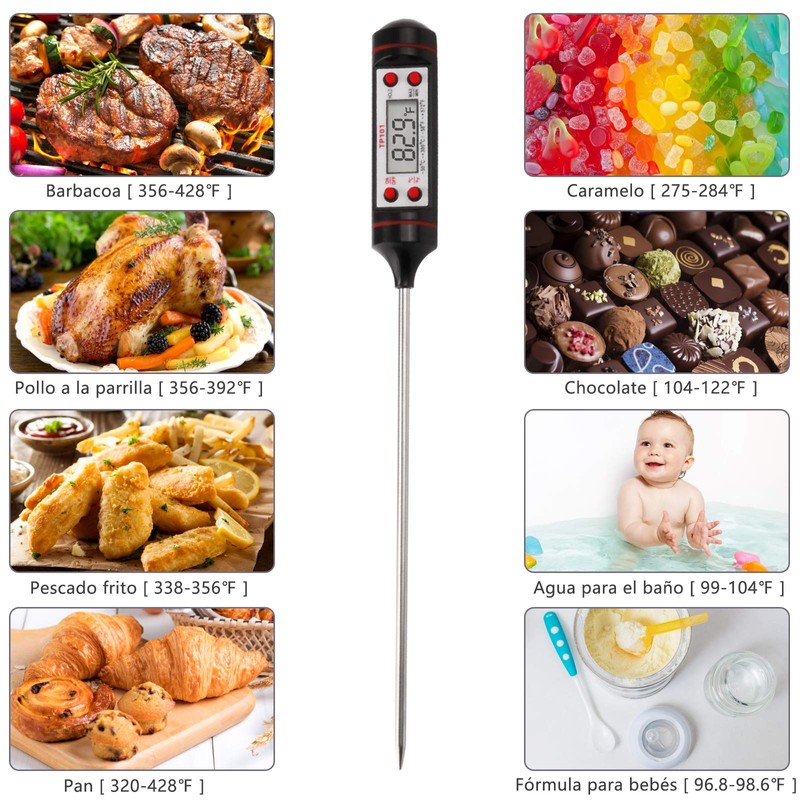 - Sonda extra larga: La sonda de nuestro termómetro cocina tiene una longitud de sonda de 6 inch.Es fácil medir los alimentos líquidos y las carnes más gruesas.