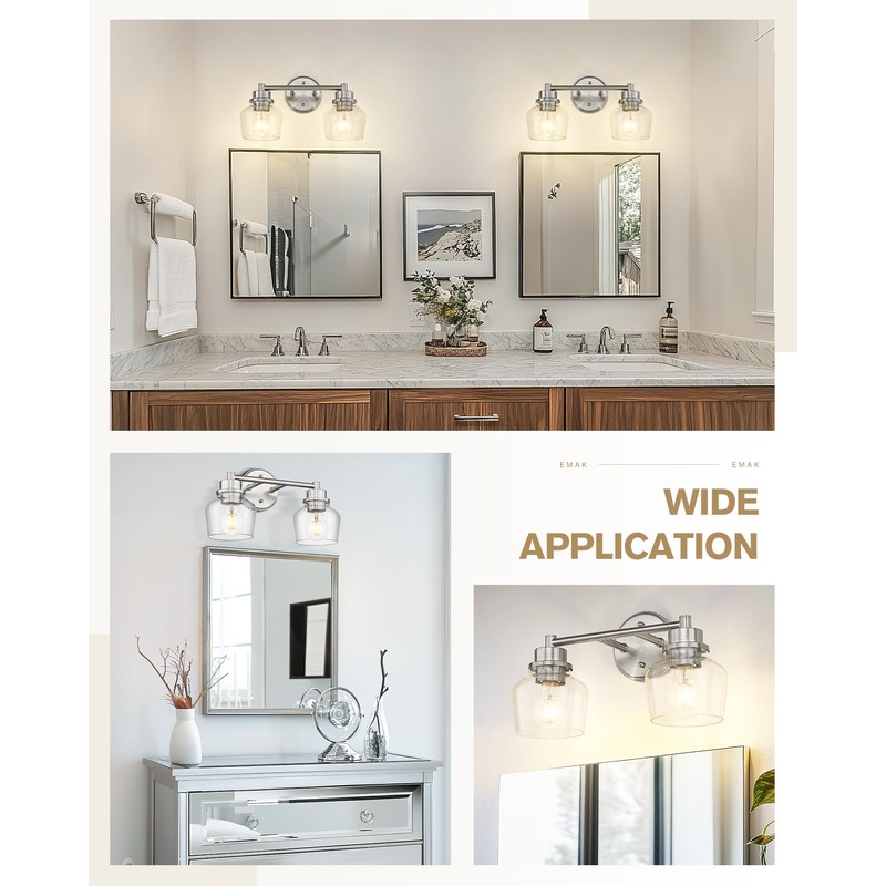 - [Elegant Design] Elevate your bathroom or vanity space with this stunning brushed nickel-finished bathroom light fixtures. Featuring clear glass shades, it delivers soft, diffused lighting that creates a cozy and welcoming atmosphere. Whether your style is modern or classic, this 2 light bathroom vanity light adds a luxurious touch to any room.