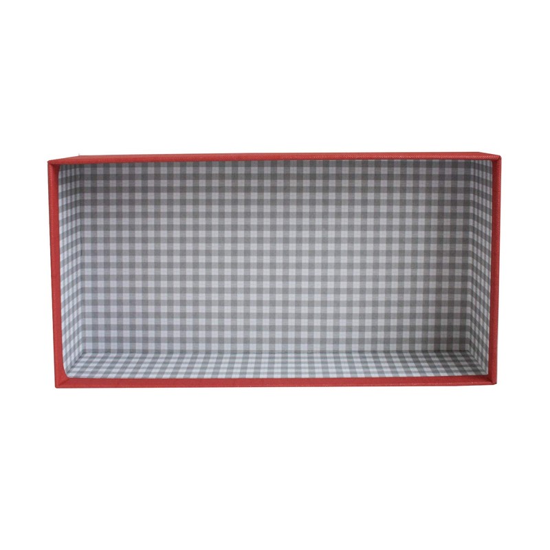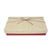 This box features an elegant Textured Red Design with a Chequered interior, beautifully finished with a Cream Lid and Striped Decorative Ribbon