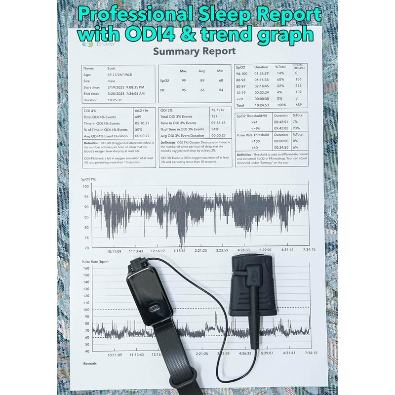 - Intelligent app allows you to review data second by second, and generate a professional sleep report with valuable data including ODI4% and trend graphs.