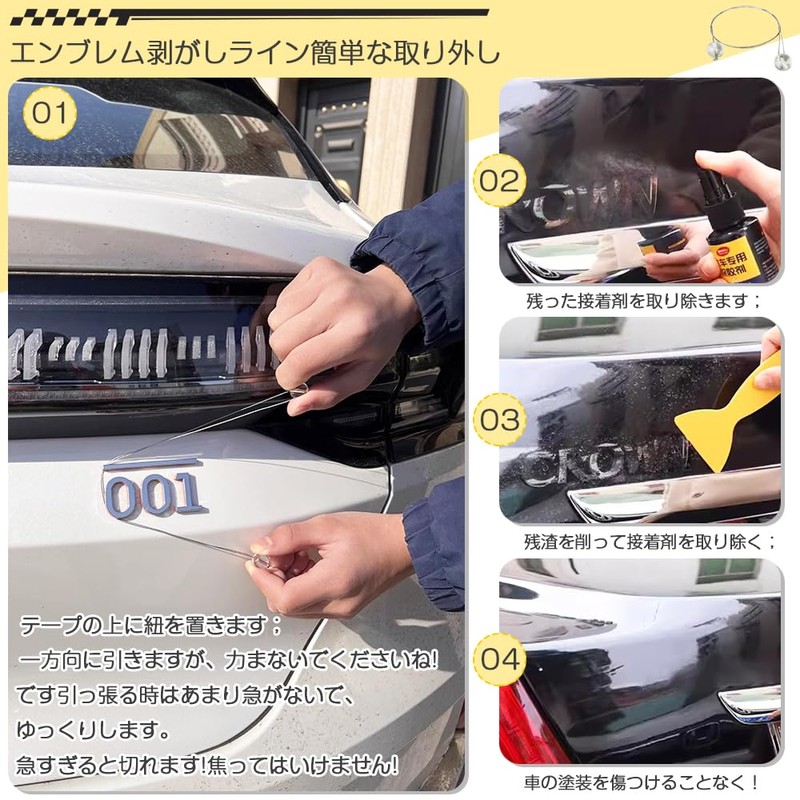 - Easy to remove: place the string on the tape; do not pull too hard, pull in one direction! ;Don't pull too fast and slow If you pull it too quickly, the string will break! Do not rush; use the adhesive removal tool to remove any residual glue; remove residue and remove glue; without damaging your car's paint!
