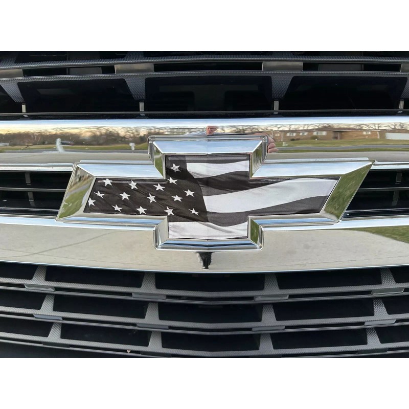 - Set of (2) Chevy Silverado Custom Printed Black/Gray American flag Grille and Tailgate Bowtie Overlay Decals.