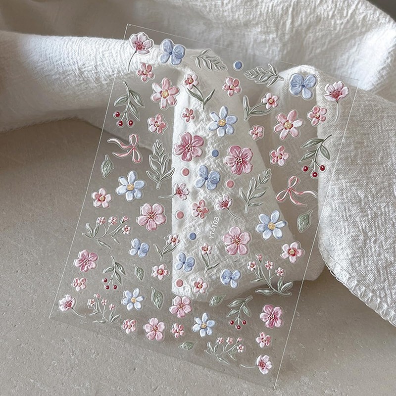Embossed Flower Nail Sticker, 5D Flowers Self-Adhesive Nail Design Sticker Pink Blue Flowers Nail Decal for Women Girls DIY Manicure Tip Flower Bow Leaf Manicure Decoration Supplies 1 Sheet