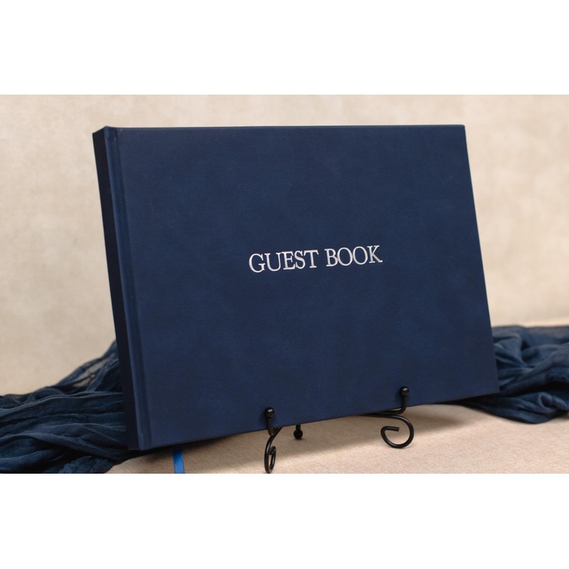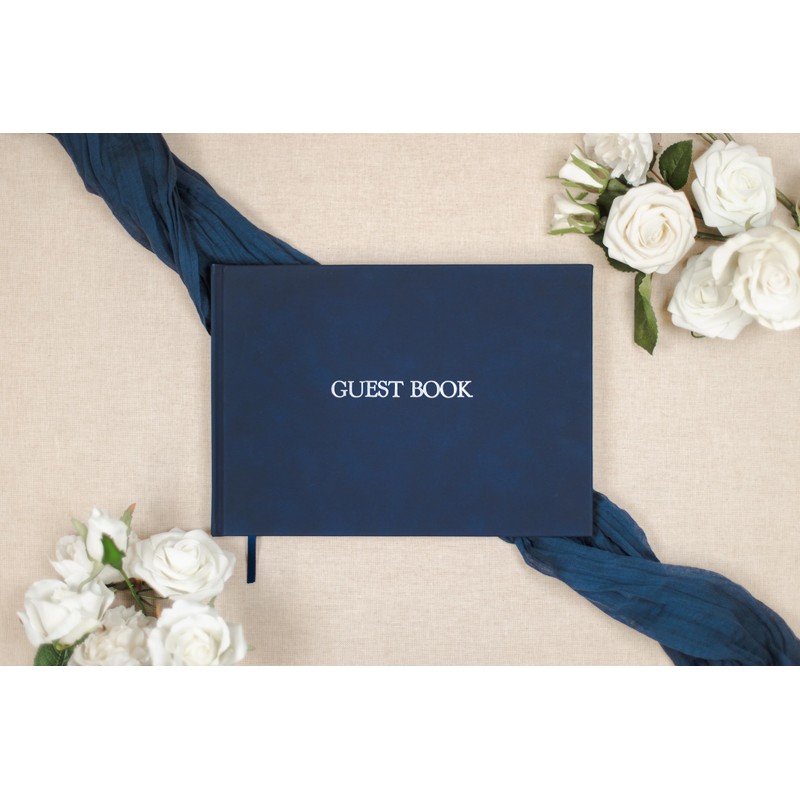 • The cover is wrapped in a smooth soft fabric. "Guest Book" embossed in silver foil on the front cover. Included built in ribbon bookmark.
