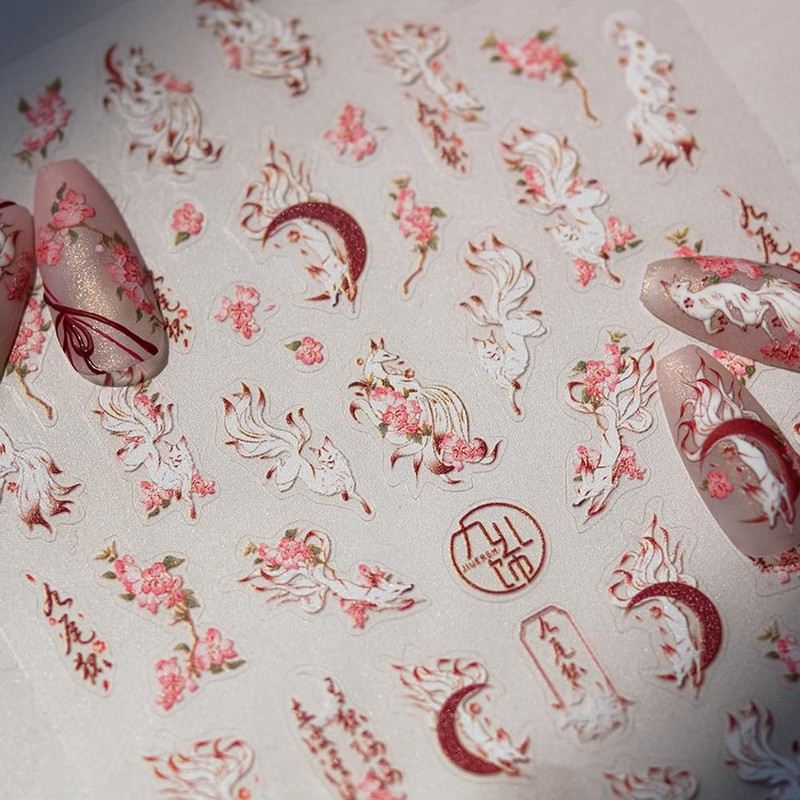 Embossed Nine-Tailed Fox Spirit Nail Art Stickers, Foxes and Blossom Design, White and Pink, Decorative Nail Decals (Nine-Tailed Fox)