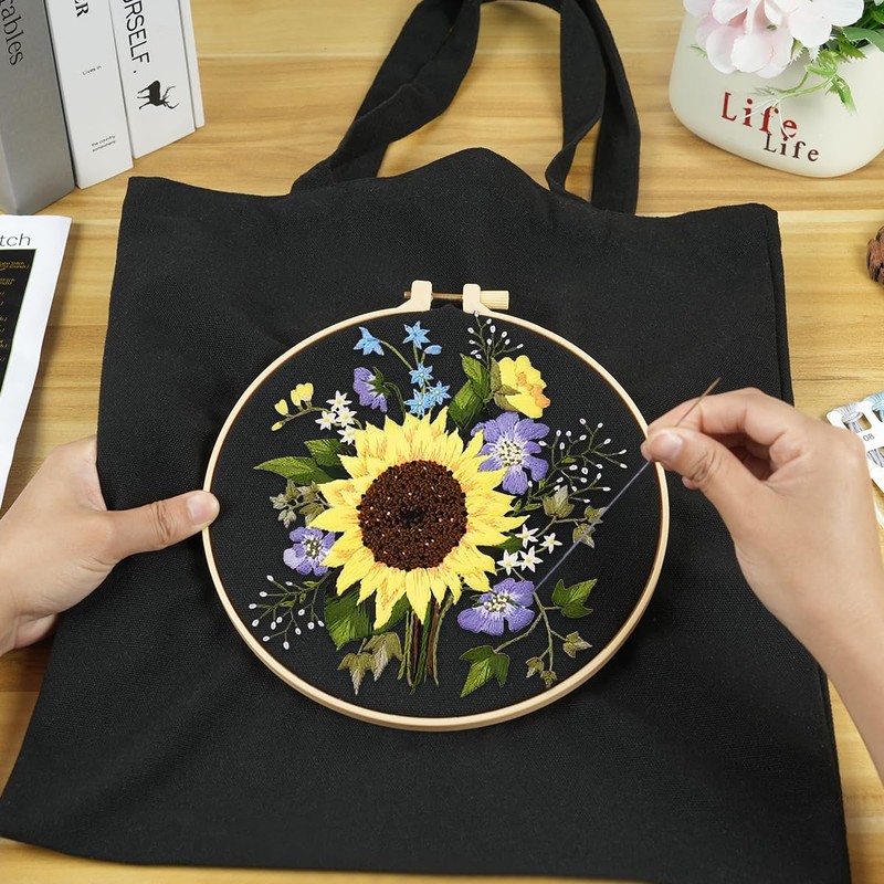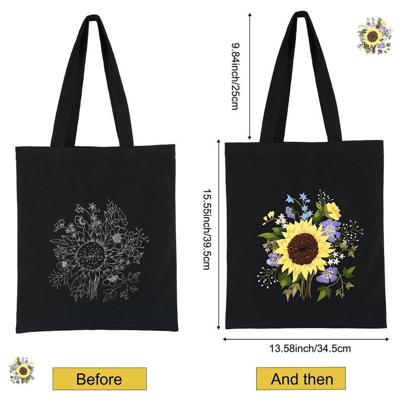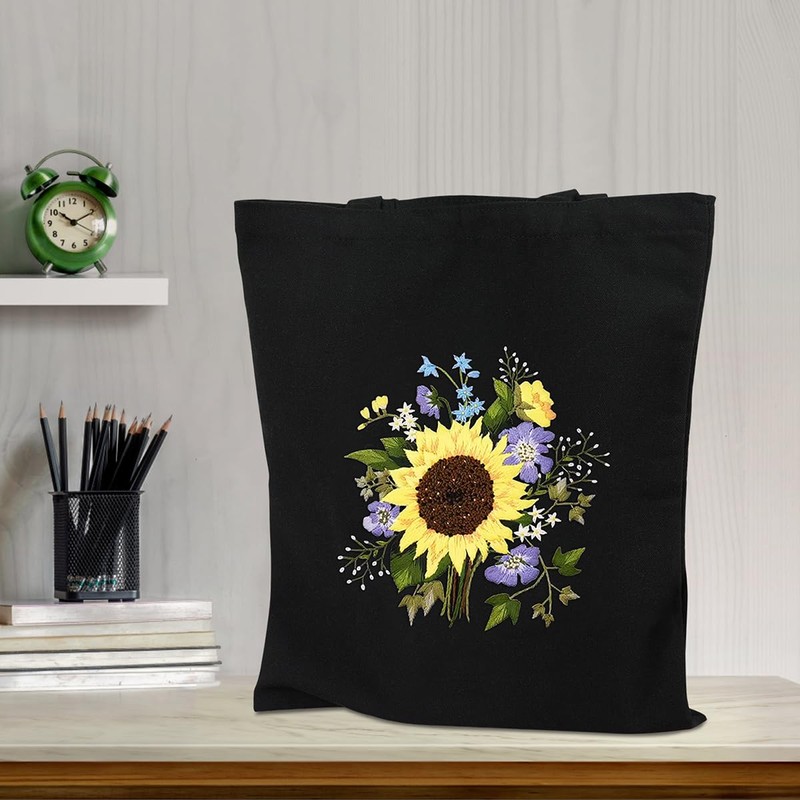 - Bright Colorful Sunflower Design: This black embroidery bag printed with delightful sunflower pattern in bright yellow purple and blue color, embroidery kits comes with 1 set colorful embroidery threads, it would be a beautiful bag for daily use, you can use it as a daily grocery bag, shopping bag, travel bag, etc.