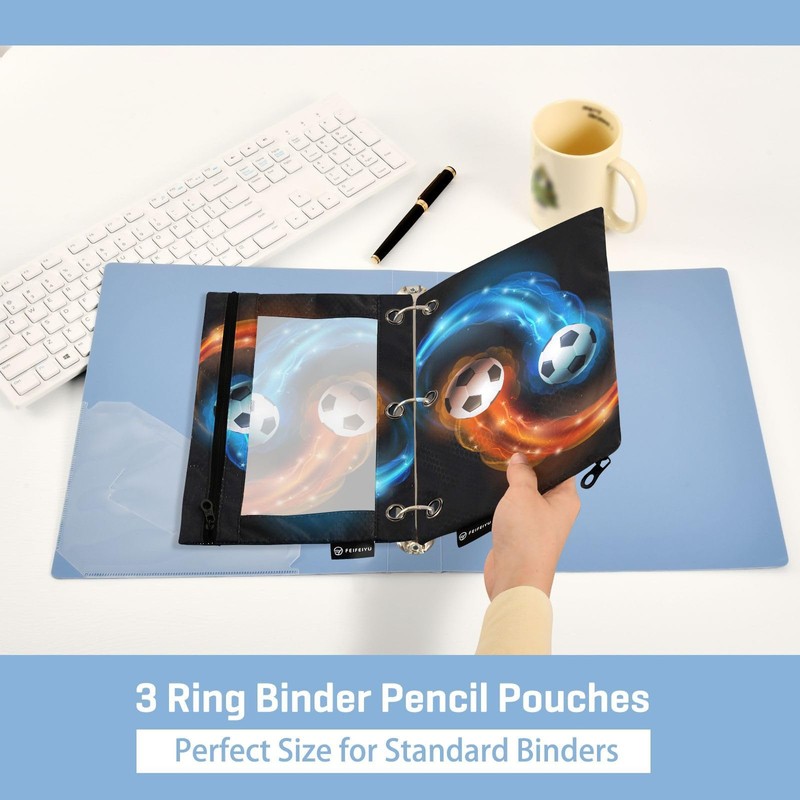 Emelivor Flames Soccer Ball Pencil Pouch for 3 Ring Binder 2 Pcs Pockets Pencil Pouches Bag with Clear Pencil Case Cosmetic Bag for Office Daily College Supplies