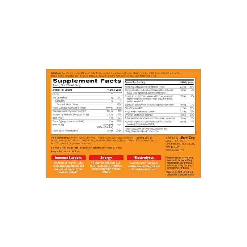 - Includes 60 single-serving packets (0.33 oz. each) of Emergen-C Original Formula in Tangerine flavor