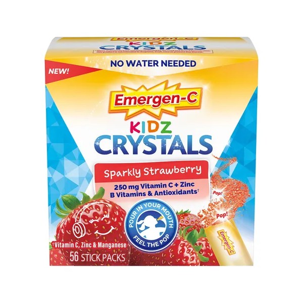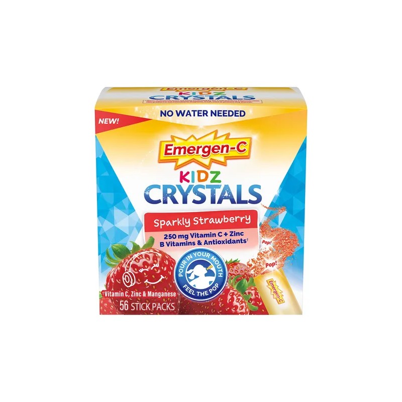 - Caja con 56 sobres de cristales Emergen-C Kidz sabor fresa chispeante, complemento inmunológico portátil con vitamina C, vitaminas B, zinc y manganeso