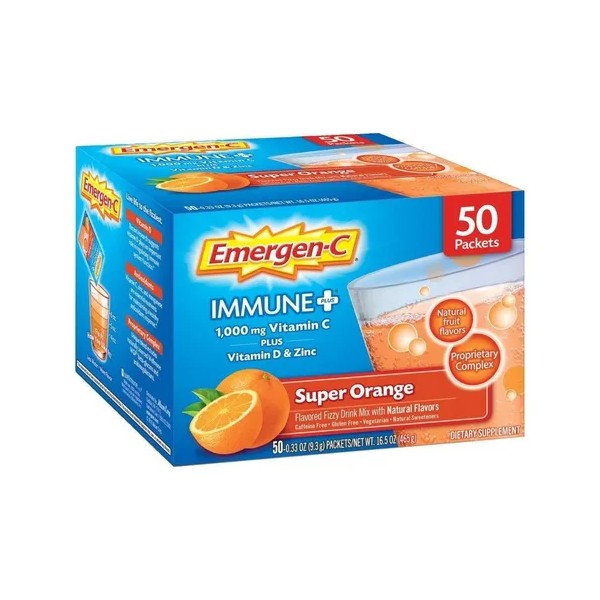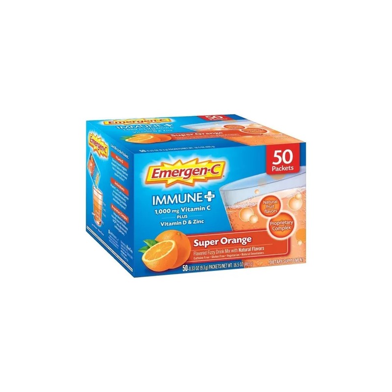 Incluye 50 paquetes de una sola porción (0.33 oz. cada uno) de Emergen-C Immune+ en sabor Super Orange.