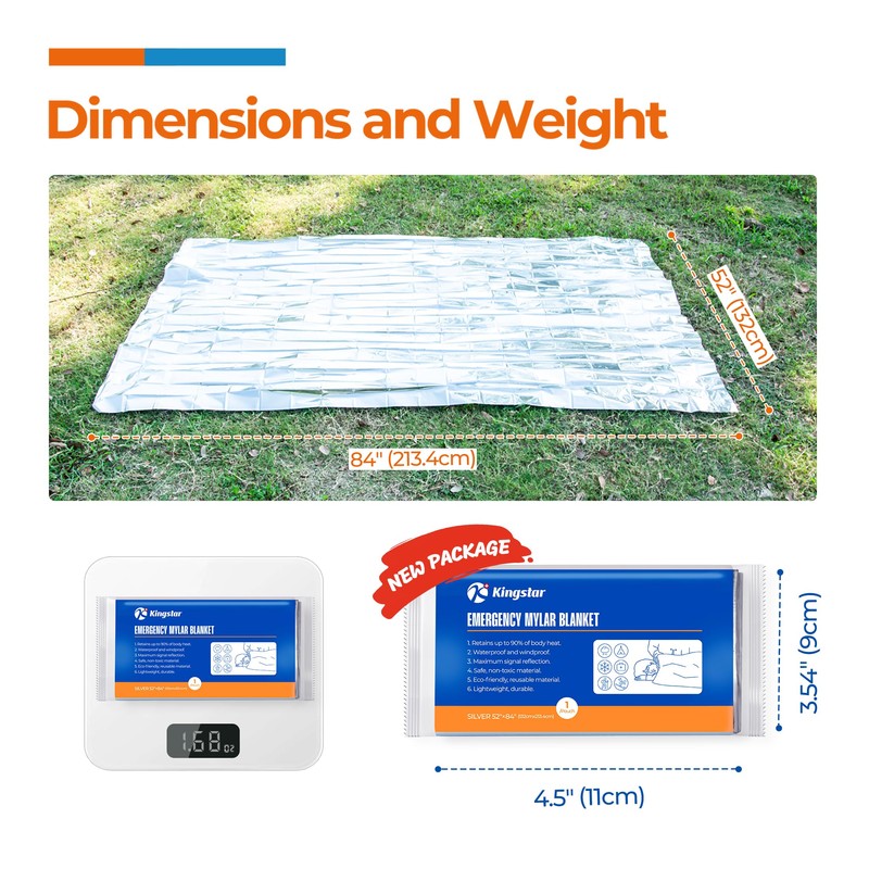 • LARGE DUAL SIDED SURFACE: The emergency blanket size is 52"x84", cover as much of head,torso,and limbs as possible,trapping body heat of human up to 6 foot 5 inch tall